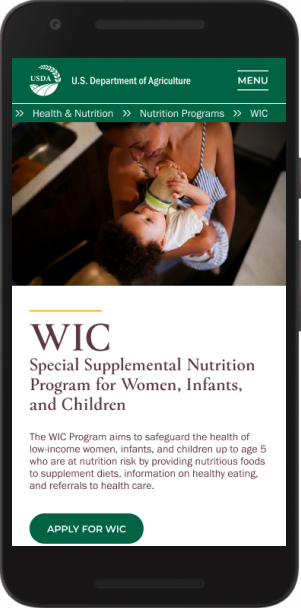 From testing, we saw that users tended to navigate by first scanning the page content for anything pointing to WIC or program applications. When they couldn't find that, they used the main menu to look for the topic they thought WIC should fall under. Because of these observations, I decided to condense the menu navigation by organizing it into the four main categories of USDA support that I naturally discovered during the card sort: