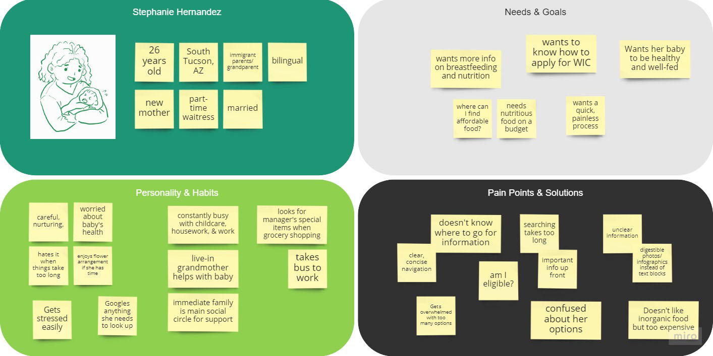 We decided that since the USDA's purpose is to help the average American, we should focus on users looking to apply to one of the USDA's many assistance programs. To help us keep these users in mind while assessing the existing design, we made the proto-persona of a new mother seeking assistance from the Supplemental Nutrition Program for Women, Infants, and Children (What a mouthful! Also widely known as WIC). Stephanie's goals are to: