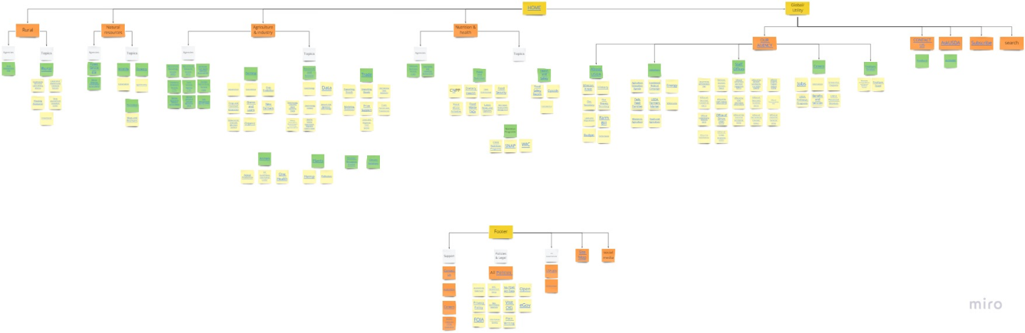 To understand why the USDA website needed a redesign in the first place, my research team and I needed to figure out who the users were, what they needed from the USDA, and how they found that information on the existing website. But even starting that process was seriously overwhelming! The existing site houses hundreds of pages for dozens of topics, programs, agencies, and initiatives. What were we supposed to focus on??