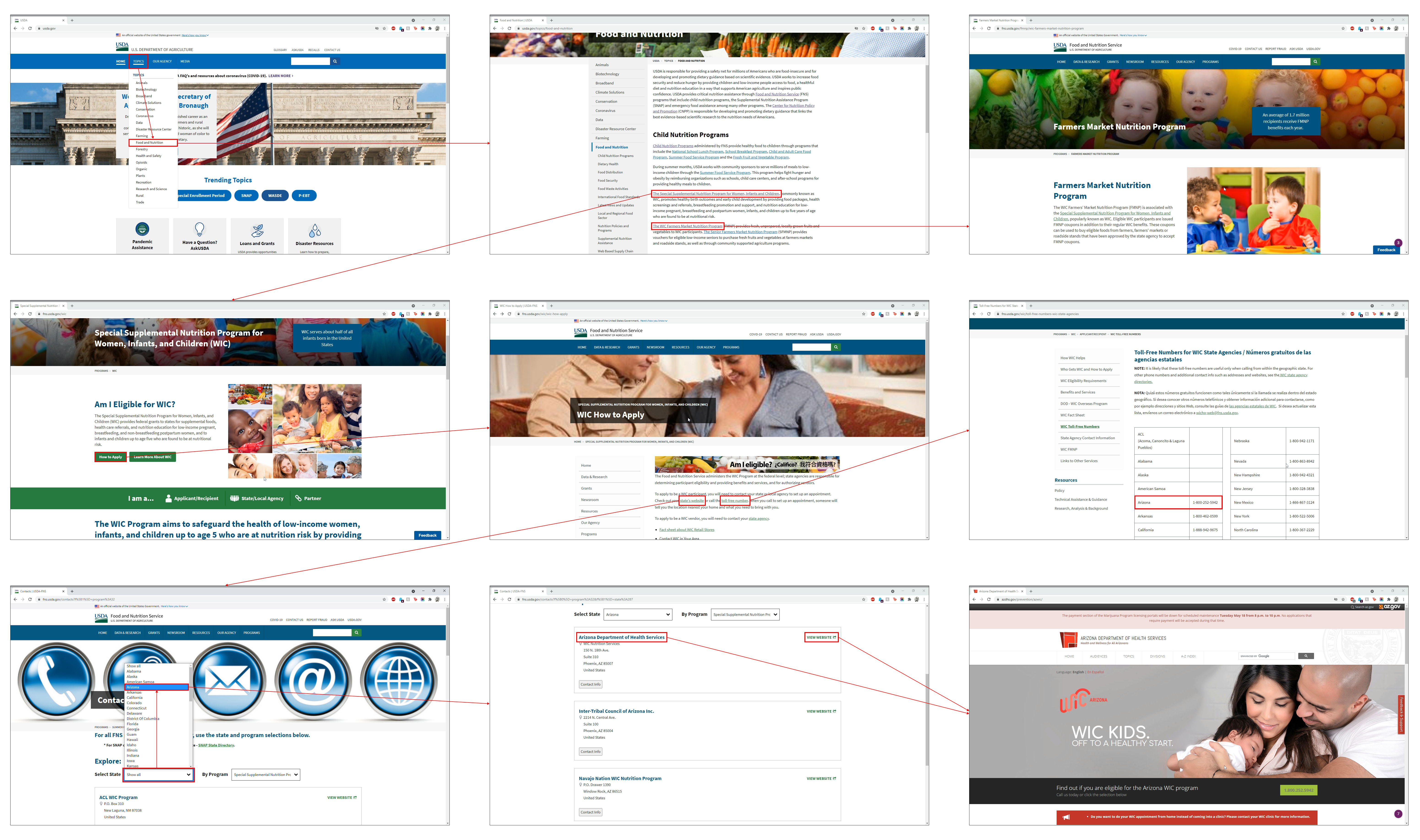 Part of understanding what to redesign came from knowing what links and pages users interacted with to get to their destinations. We figured this out by mapping the possible paths Stephanie could take to get from the USDA homepage to the WIC application page. The shortest paths she could take were: